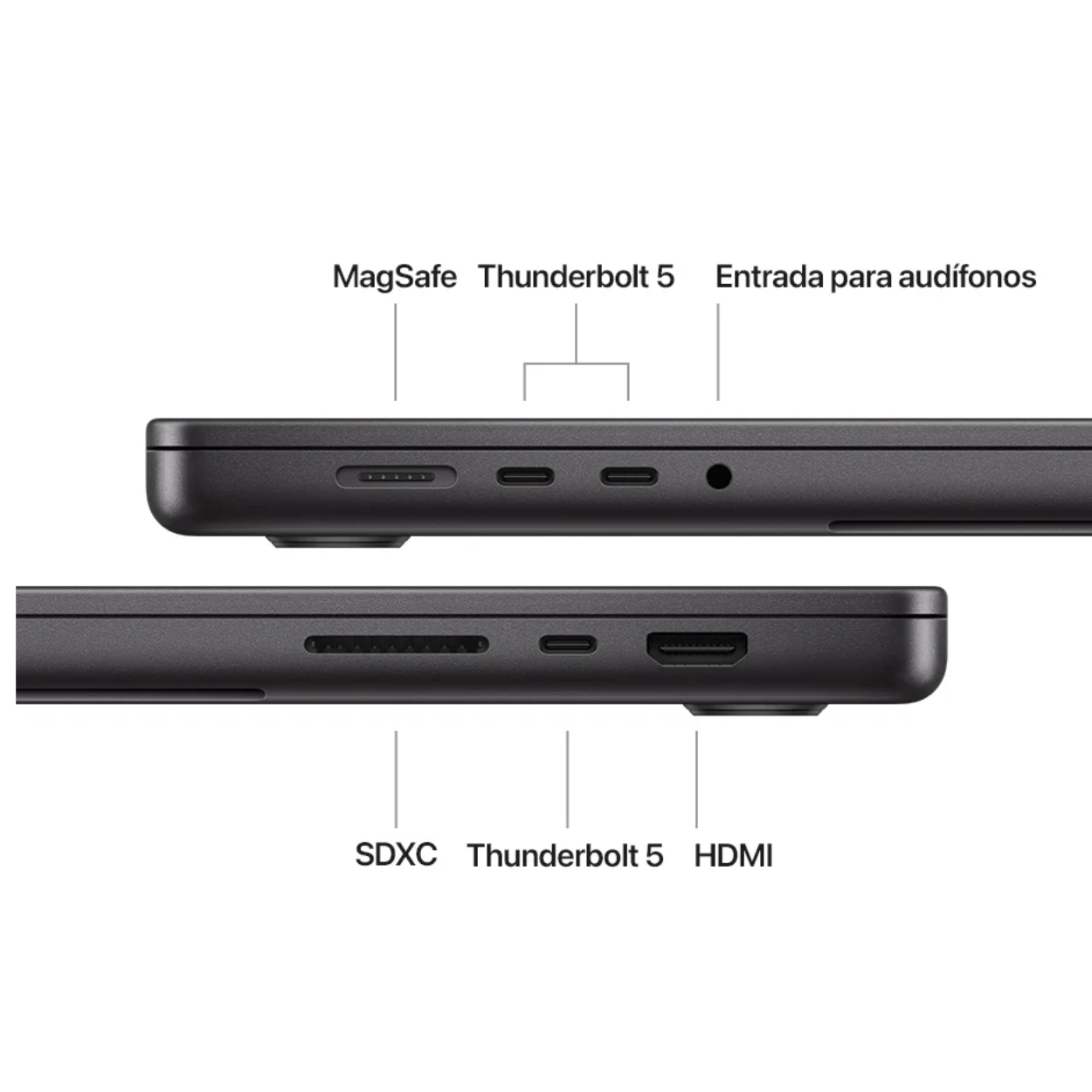 • Conectividad avanzada: incluye tres puertos Thunderbolt 5, HDMI 8K, ranura para tarjetas SDXC, MagSafe 3, Wi‑Fi 6E y Bluetooth 5.3.